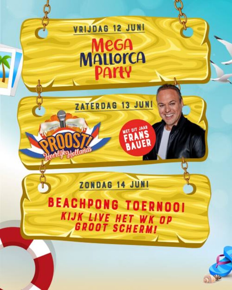 ๐ฃ๐น๐ฎ๐๐ฎ ๐๐ฒ๐น ๐ ๐ฒ๐ฟ๐ ๐ฎ๐ฌ๐ฎ๐ฒ! Dit jaar geniet je maar liefst 2 weekenden met je voeten in het zand van Playa del Merx. Het wordt groter dan OOIT! Het weekend van 12,13,14 juni geniet je weer van onze leukste events. Vrijdag pakken we weer groots uit met de Mega Mallorca Party. De biertorens zijn er natuurlijk weer bij. Zaterdag kun je meezingen op heerlijke Hollandse hits tijdens PROOST! ๐ณ๐ฑ Niemand minder dan Frans Bauer klimt dit jaar op ons podium. ๐ค Op zondag slaan we natuurlijk weer een balletje bij het Mega-Beachpong toernooi. Inschrijven kan vanaf 10 april aan de bar van de Merx. Het WK is dan ook in volle gang dus kijken we aansluitend de wedstrijd van onze oranje leeuwen op groot scherm.