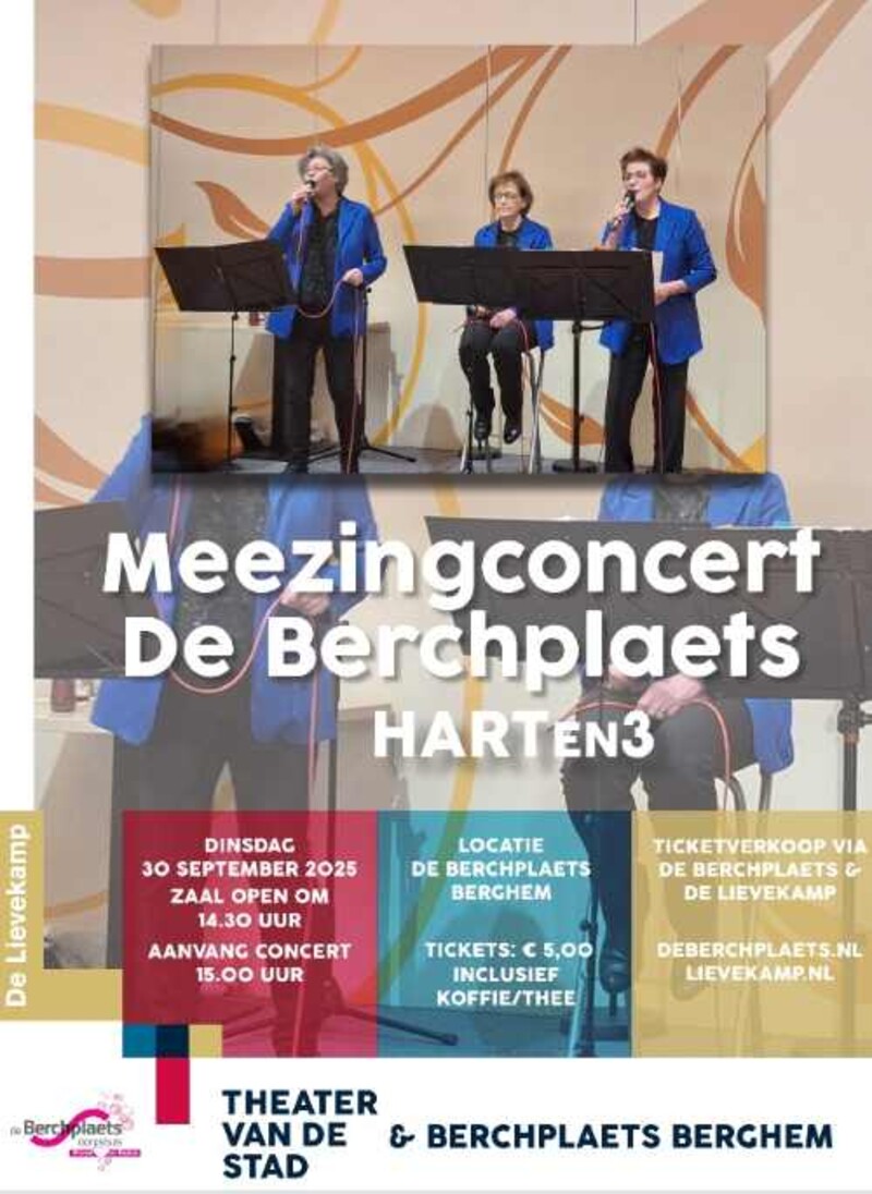 Zing je graag mee met bekende liedjes? Kom dan naar onze gezellige Meezingconcert met HARTen3 op dinsdag 30 september! Van klassiekers tot meezingers – alles komt voorbij. Je hoeft geen zangtalent te zijn, enthousiasme is genoeg!