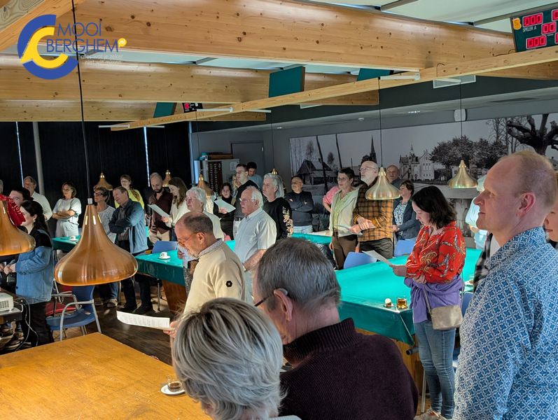 Een bijzonder moment was het gezamenlijk zingen van het Bergse lied. Theo van Ravenstein, ook wel bekend als ‘Mister Knollenrijk’, zong het vol enthousiasme voor. Waar bij een eerdere editie nog nauwelijks werd meegezongen, had de dorpsraad dit keer een oplossing bedacht: de tekst werd uitgedeeld én op een groot scherm getoond. Er werd al voorzichtig meegezongen een mooie eerste stap. Want, zoals werd gezegd: iedere Berghemnaar zou het Bergse lied eigenlijk moeten kennen. De eerste les in de ‘integratie’ dus! Theo vertelde daarnaast over het Knollenrijk en de activiteiten van Stichting Carnaval Berghem.
