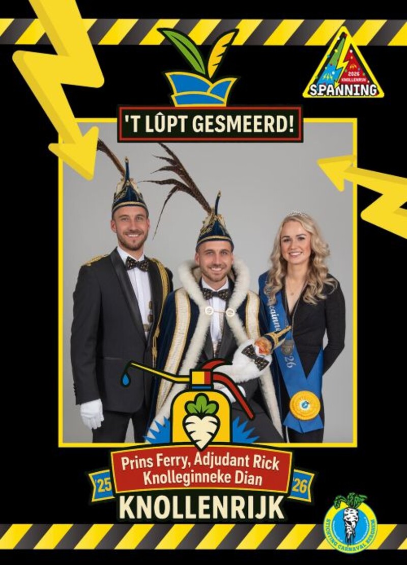 Zaterdagavond 22 november 2025 zijn Prins Ferry d’n Urste, Adjudant Rick en Knolleginneke Dian door burgemeester De Jonge onthuld in residentie De Merx. De onthulling stond in het teken van het thema ‘Spanning’.Ferry van der Sloot (33) woont samen met Helge en hun 2 kinderen. In het dagelijks leven is hij