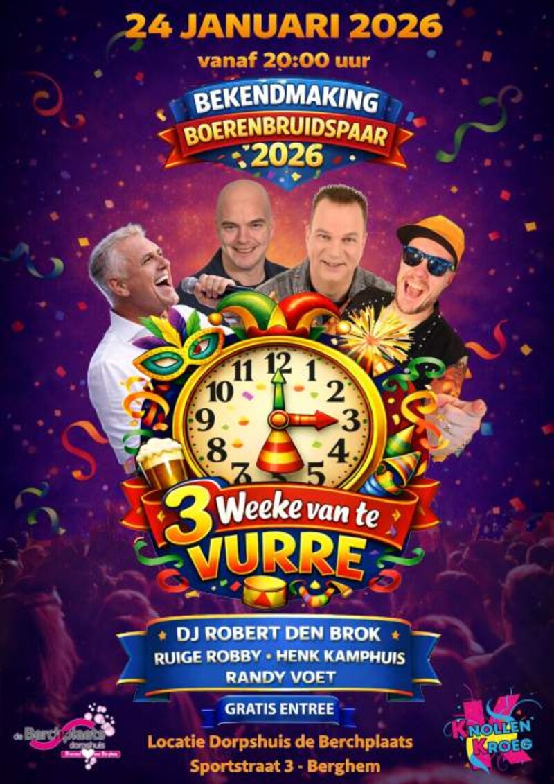 '3 weeke van te vurre' op 24 januari; regionale artiesten en bekendmaking het Boerenbruidspaar 2026!