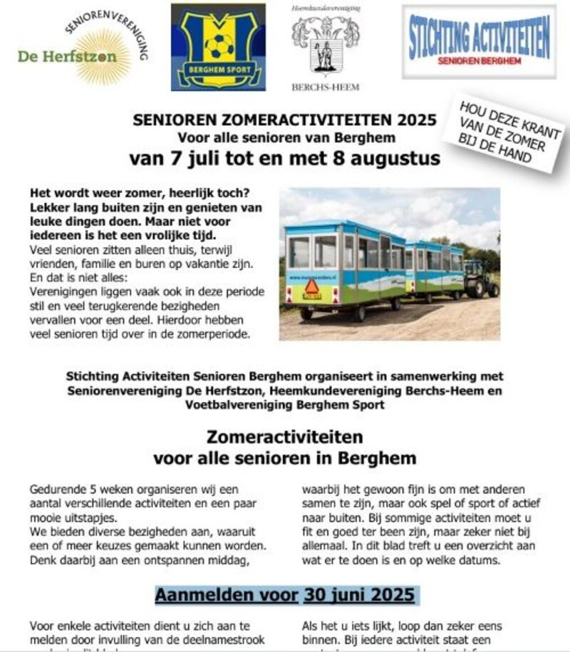 Stichting Activiteiten Senioren Berghem organiseert daarom in samenwerking met Seniorenvereniging De Herfstzon, Heemkundevereniging Berchs-Heem en Voetbalvereniging Berghem Sport Zomeractiviteiten voor alle senioren in Berghem van 7 juli tot en met 8 augustus 2025. Lees hier verder voor alle zomeractiviteiten en let op, aanmelden voor 30 juni 2025!