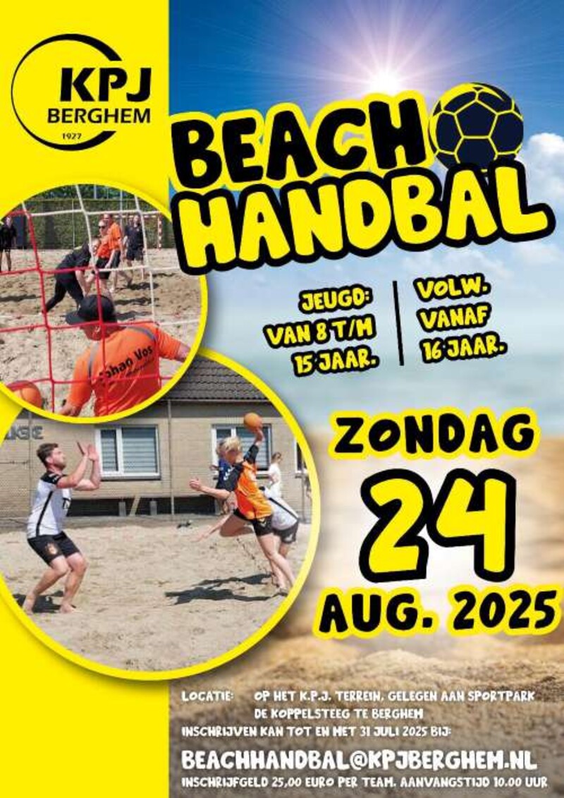 Zondag 24 augustus is het zover voor het welbekende beachhandbaltoernooi van KPJ Berghem. Zijn jullie d'r weer klaar voor? Het toernooi zal dit jaar gehouden worden bij het clubhuis van de KPJ (Sportpark de Koppelsteeg, Osseweg). Ook al heb je nog nooit gehandbald en misschien een conditie van niks, het wordt sowieso dolle pret! Maar voor het zover is, is er voor de organisatie nog wel behoorlijk wat werk te verzetten. De bitumen velden moeten omgedoopt worden in een zandbak.