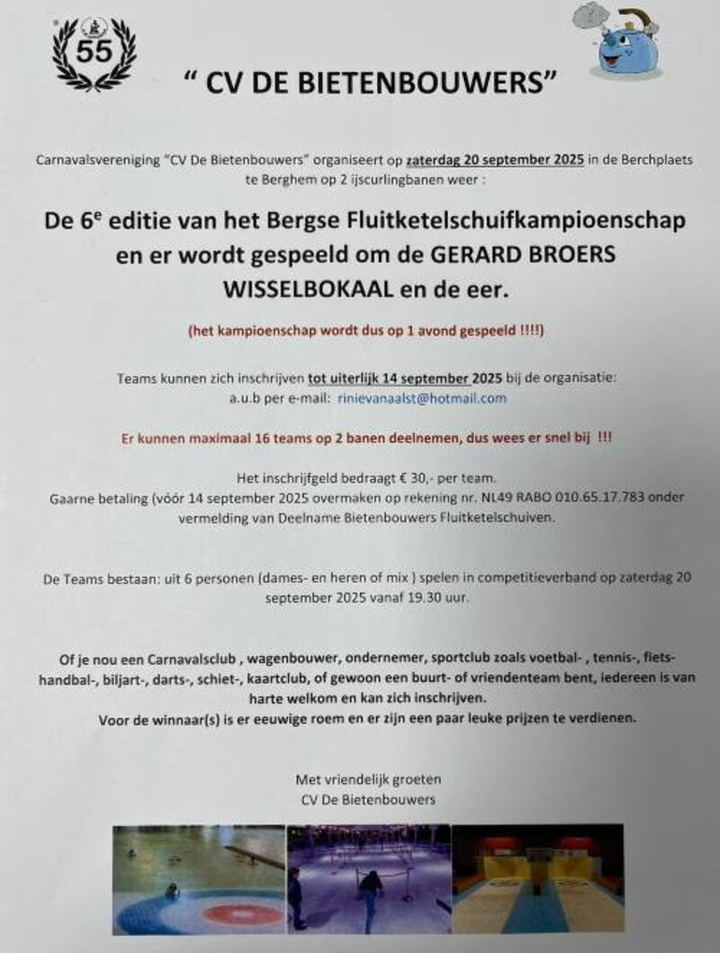 Carnavalsvereniging “CV De Bietenbouwers” organiseert op zaterdag 20 september 2025 in de Berchplaets te Berghem op ijscurlingbanen weer het 6e Bergse fluitketelschuivenkampioenschap. Het kampioenschap wordt op 1 avond gespeeld!. Teams kunnen zich inschrijven tot uiterlijk 14 september 2025 bij de organisatie: