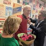Op dinsdagavond 14 april heeft voormalig SP-raadslid Adrie Geerts uit Berghem tijdens een bijeenkomst en in het bijzijn van zijn vrouw Diny de zilveren tomaat ontvangen uit handen van fractievoorzitter Henk van Gerven. Nadat Adrie op 31 maart door burgemeester Froukje de Jonge al een koninklijke onderscheiding opgespeld kreeg voor zijn 13 jaar inzet in de gemeenteraad van Oss heeft het bestuur van de SP
