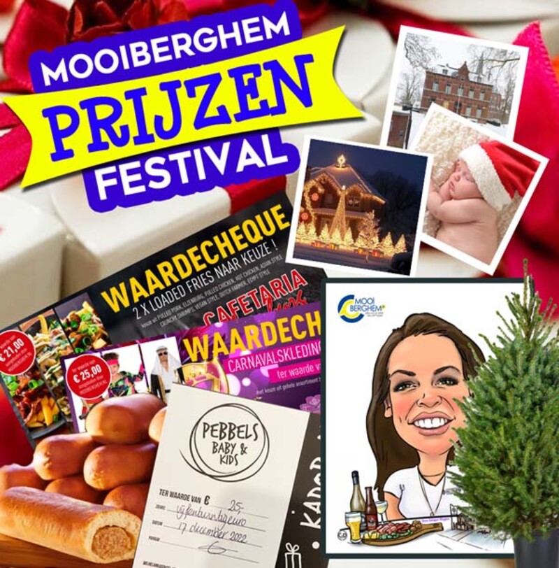 Een paar prijzen staan hier afgebeeld zoals diverse cadeaubonnen t.w.v 25 euro. Maar Mooi Berghem heeft ook andere fantastische prijzen, zoals een karikatuur van Carroline van Dijk t.w.v. 95 euro, en echte duurzame kerstbomen voor 2023 van kerstbomenkwekerij Bergse Boom, en nog meer prachtige prijzen in petto!