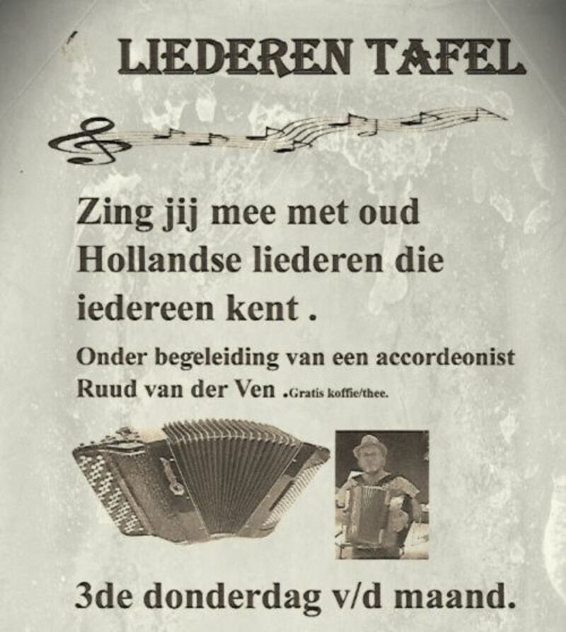 Accordeonist Ruud van der Ven uit Berghem begeleid elke 3e donderdag van de maand een liederentafel met oude Hollandse muziek die iedereen mee kan zingen. Toegang en kopje koffie en thee is gratis. De volgende editie is op