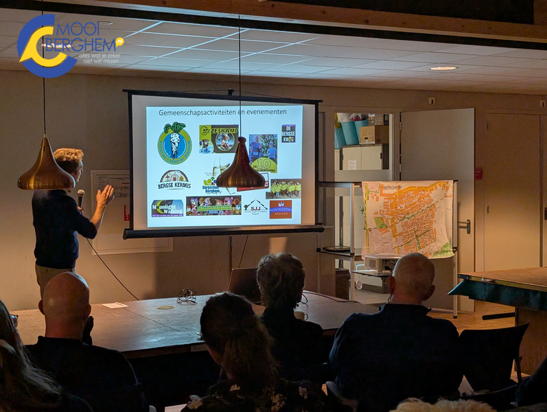 Harmen Snoeijs vertelde over de rol en activiteiten van dorpsraad Berghem en Petra Manders liet weten wat er allemaal te doen is in het bruisende hart van Berghem, dorpshuis De Berchplaets.