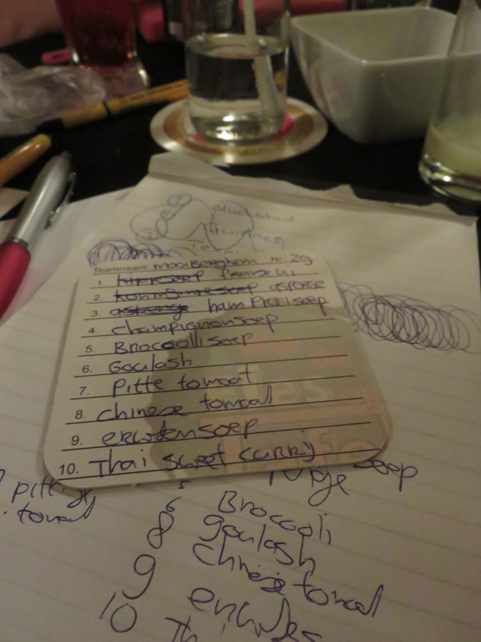 ook voor "de proefronde" weet de organsiatie steeds een verrassend element te verzinnen. Gisteren kregen alle teams 10 soorten cup-a-soup aangereikt, en moesten zij deze weten te benoemen. Voor sommige een helse klus, gezien de 'vieze' gezichten trekkende deelnemers. Na zo'n 2,5 uur vragen en met de fles op tafel hangen, moesten 2 gelijk geeindigde teams een shoot-out vraag beantwoorden. Met deze laatste vraag zat het team "de Brouwers" er het dichtste bij, en zij mocht de wisselbeker in ontvangst nemen.Gefeliciteerd namens de redactie van MooiBerghem, wij moesten met een 24e plaats genoegen nemen, maar we hadden wel een portie bitterballen gewonnen!!!
