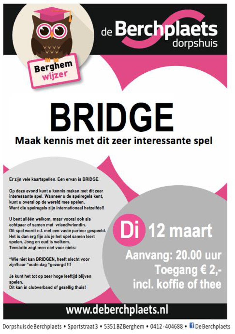 Kennismaken met Bridge, dinsdag 12 maart bij de Berchplaats
