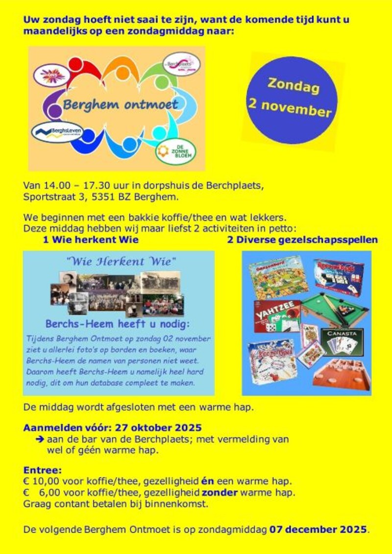 Op de laatste zondag van oktober (26 oktober) vindt weer de grote gesorteerde rommelmarkt plaats van Stichting Carnaval Berghem. Een zeer grote hoeveelheid aan gesorteerde 2e hands spullen wordt hier te koop aangeboden tegen zeer aantrekkelijke prijzen. Op het Meester Gielenplein staat inmiddels al een forse tent en