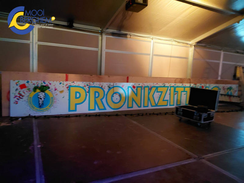 Achter zalencentrum De Merx wordt met man en macht gewerkt aan de laatste voorbereidingen voor de Pronkzitting. Waar kort geleden nog een kale constructie stond, verrijst nu in rap tempo een indrukwekkende megatent. De laatste werkzaamheden zijn in volle gang en de finishing touch wordt aangebracht om alles tot in de puntjes gereed te maken. De verlichting is aangesloten en wordt volop getest, tv-schermen hebben een prominente plek gekregen