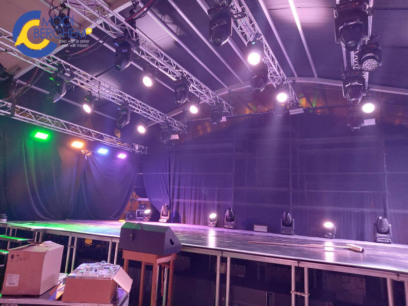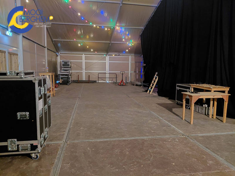 en ook de geluidsinstallatie draait inmiddels op volle toeren. Daarnaast zijn de toiletten en de fietsenstalling geplaatst. Met elke stap groeit de sfeer en wordt de tent omgetoverd tot een bruisende feestlocatie, helemaal klaar voor avonden vol muziek, humor, lachsalvo’s en gezelligheid.