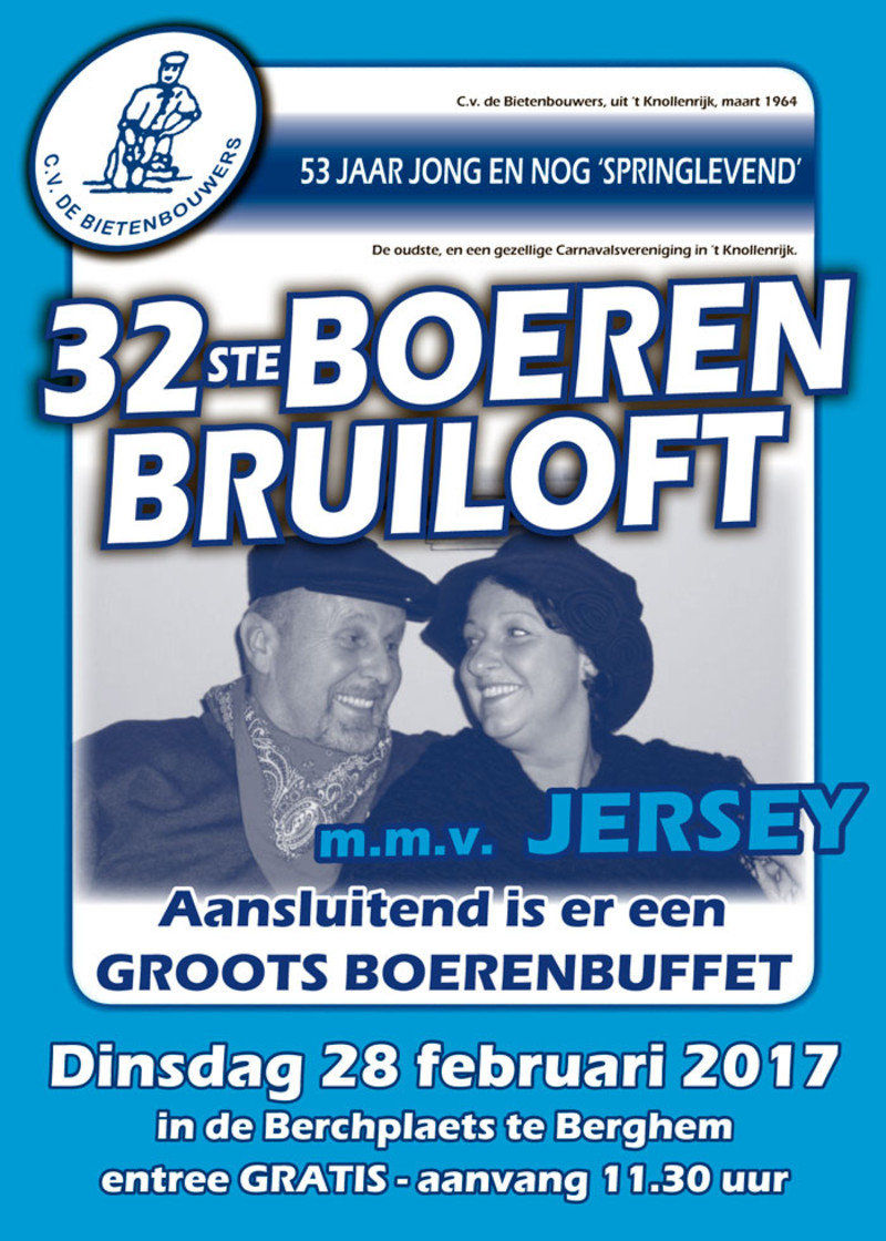 Tijdens de Tuureindse Zondagmerrege in dorpshuis de Berchplaets in Berghem is op 28 januari de verloving bekendgemaakt van het Berghemse boerenbruidspaar van 2017. John Dollevoet en Wendy v/d Broek zullen elkaar op 28 februari, tijdens de boerenbruiloft, een weloverwogen onheus jawoord geven. Het is voor de achtentwintigste keer dat carnavalsvereniging de Bietenbouwers de boerenbruiloft organiseert. Het is een traditie dat de carnavalsvereniging tijdens de Tuureindse Zondagmerrege het aanstaande paar onthult.
