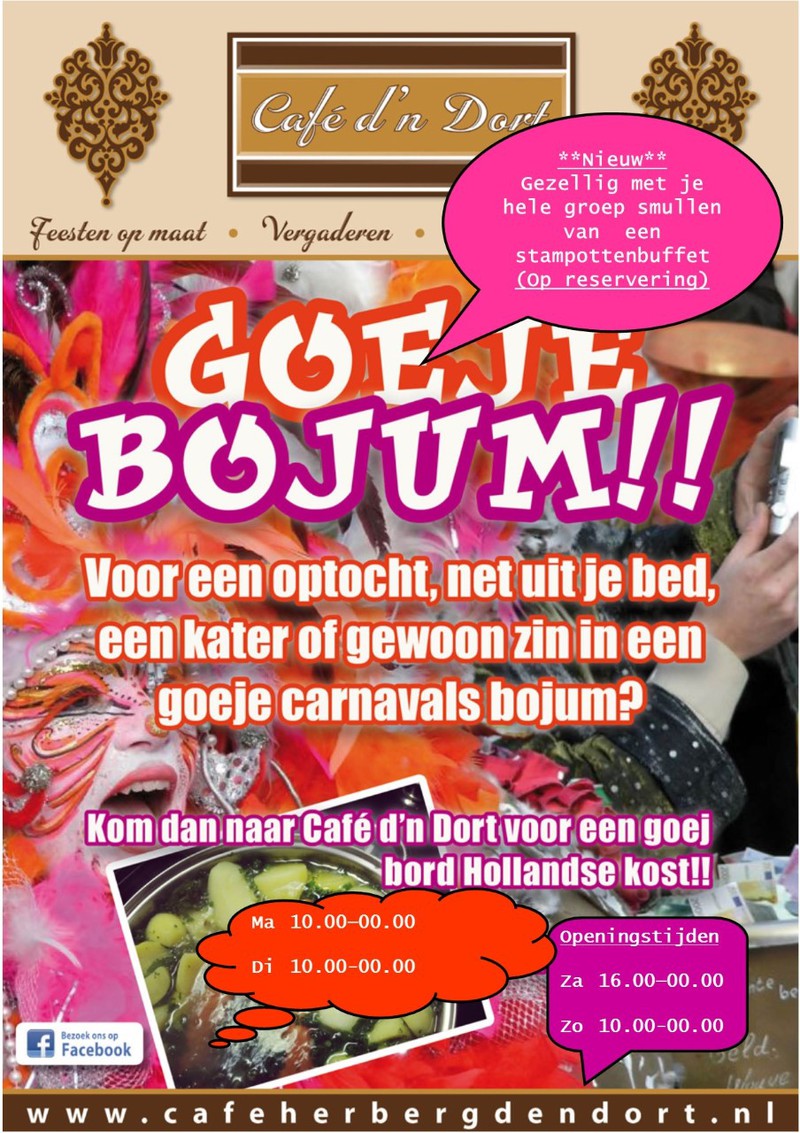 Voor d'n optocht, net uit je bed, bij een kater of hedde gewoon zin in een goeje carnavals bojum? Dan zit je ook dit jaar weer goed bij d'n Dort. Hollandse happen voor een carnavalsprijsje staan er deze dagen op het menu. Voor het eerst kun je ook een Goeje Bojum stamppottenbuffet voor jou en je Carnavalsgroep reserveren. Dan witte zeker da ge terecht kunt ! Voor meer informatie en boekingen 06-29433788