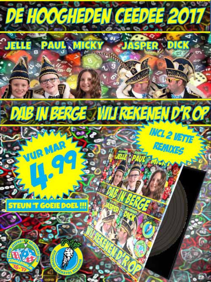 Prins Jasper d'n Urste en adjudant Dick presenteren morgen hun eigen carnavalskraker tijdens het Krakerfestival. Dit jaar is er een echte Hoogheden CeeDee want ook onze jeugdhoogheden hebben een prachtig lied gemaakt! De CD's zullen te koop aangeboden worden voor een richtprijs van 4.99. De opbrengsten van de verkoop komen ten goede aan