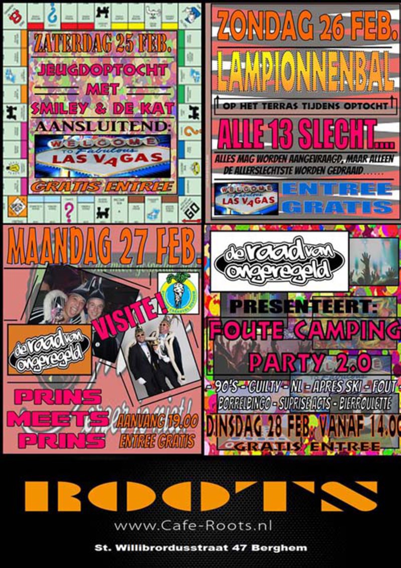 Nog even en dan is het weer carnaval! 4 dagen lang feest bij cafe de Roots, elke dag weer anders! Zaterdag 25 februari de jeugdoptocht met DJ Smiley en de Kat en aansluitend Las Vegas. Zondag 26 februari lampionnenbal op het terras tijdens de Verlichte Optocht. Maandag 27 februari prins meets prins met Prins van het Knollenrijk en de prins van Raad van Ongeregeld.