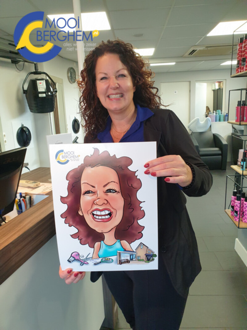 'Hier zoek ik een mooi plaatsje voor. Misschien wel hier in de kapsalon', gaf Marielle aan. 'Bij de 1e tekening stroomden de appjes en telefoontjes binnen. Dat ben jij!'. Maar ik zag het nog niet. Wel bij de tweede tekening. Ja, dat ben ik!', lachte ze. Natuurlijk was het duidelijk bij de derde tekening met de attributen. De kapsalon, de fohn en de schaar en het bankje met de logo's van Ondernemers Vereniging Berghem en C.V. de Centrumknollen.