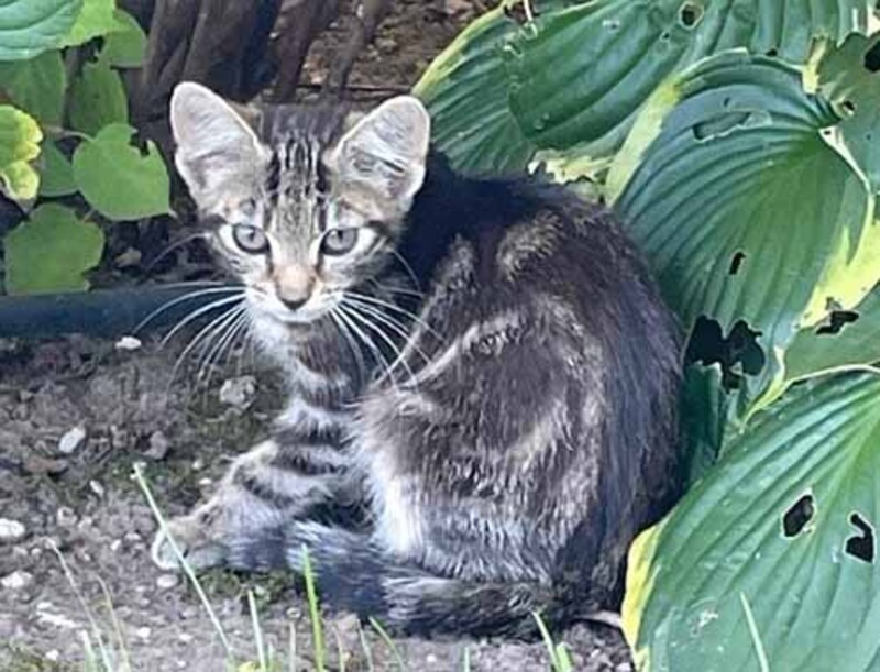 Wie mist deze jonge poes? Deze zwarte, grijze en witte poes is gevonden in de Spaanderstraat in Berghem.