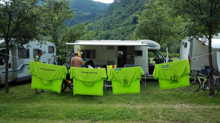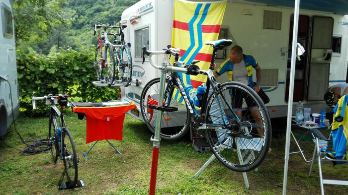 kamp en de "werkplaats" weer opgebouwd en de Berghemse vlag was goed zichtbaar. Nu lekker uitrusten en dan opmaken voor morgen, een relatief vlakke etappe!