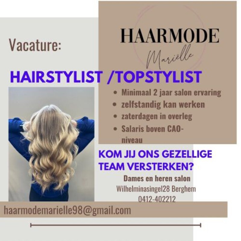Haarmode Marielle is gevestigd aan de Wilhelminasingel 28 in Berghem. Ze zijn op naar zoek naar haar- en topstylist(e)! Ben jij die leuke, collegiale en allround hairstylist(e) die het gezellige team van Haarmode Marielle wil versterken? Ben jij die allround hairstylist(e), heb je minimaal 2 jaar