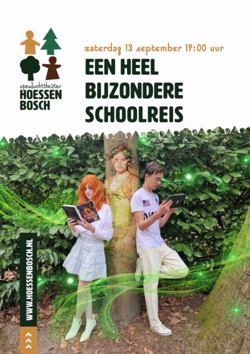 De jeugdgroep van Hoessenbosch bestaat 10 jaar en viert dit met de feestelijke voorstelling Een Heel Bijzondere Schoolreis. Het stuk vertelt het spannende en magische verhaal van een groep leerlingen op kamp, waarin pesten, vriendschap en zelfs een mysterieuze bosgeest een rol spelen. Een eigentijdse voorstelling, geschreven door Bram Wiekens en gespeeld door de talenten van de jeugdgroep. Aanvang: 19.00 uur. Tickets zijn verkrijgbaar via www.hoessenbosch.nl.