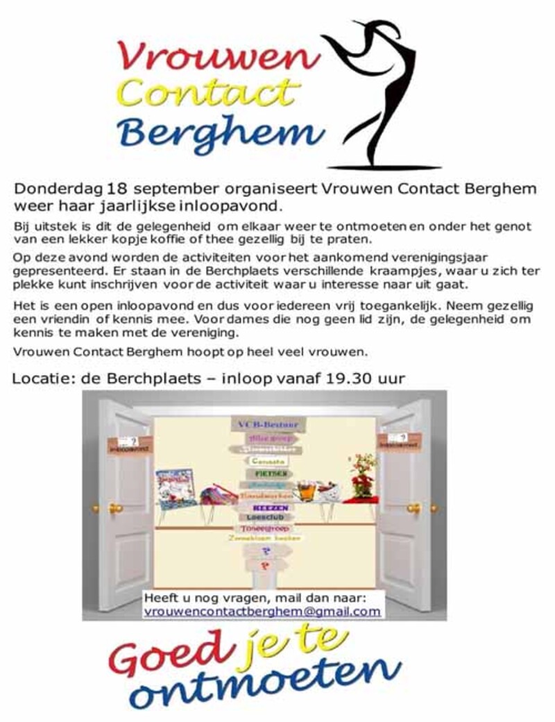 Vrouwen Contact Berghem is een gezellige en actieve vereniging die interessante bijeenkomsten, lezingen en uitstapjes organiseert gericht op vrouwen. Tijdens de inloop op donderdag 18 september bent u vanaf 19.30 uur welkom voor een nadere kennismaking in de Berchplaets. Bij uitstek een gelegenheid om elkaar beter te leren kennen onder het genot van een kopje koffie.