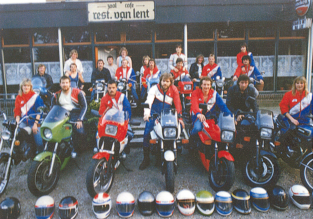 Begin jaren 80 kwamen deze motorrijders op zondagmorgen bij elkaar om in Nederland rond te toeren en eens per jaar naar de TT in Assen te gaan. Ze vertrokken vroeg in de morgen om de weg voor hen alleen te hebben en een mooie rit te maken. Café van Lent was de stamkroeg, later werd de Molenhoek hun clubhuis. Wie staan er op de foto? In ieder geval staan Angelica Brands, Paul van Grunsven, Ad Bloem, Ineke Mulders, Peter Brands, Robert Hoefnagels,