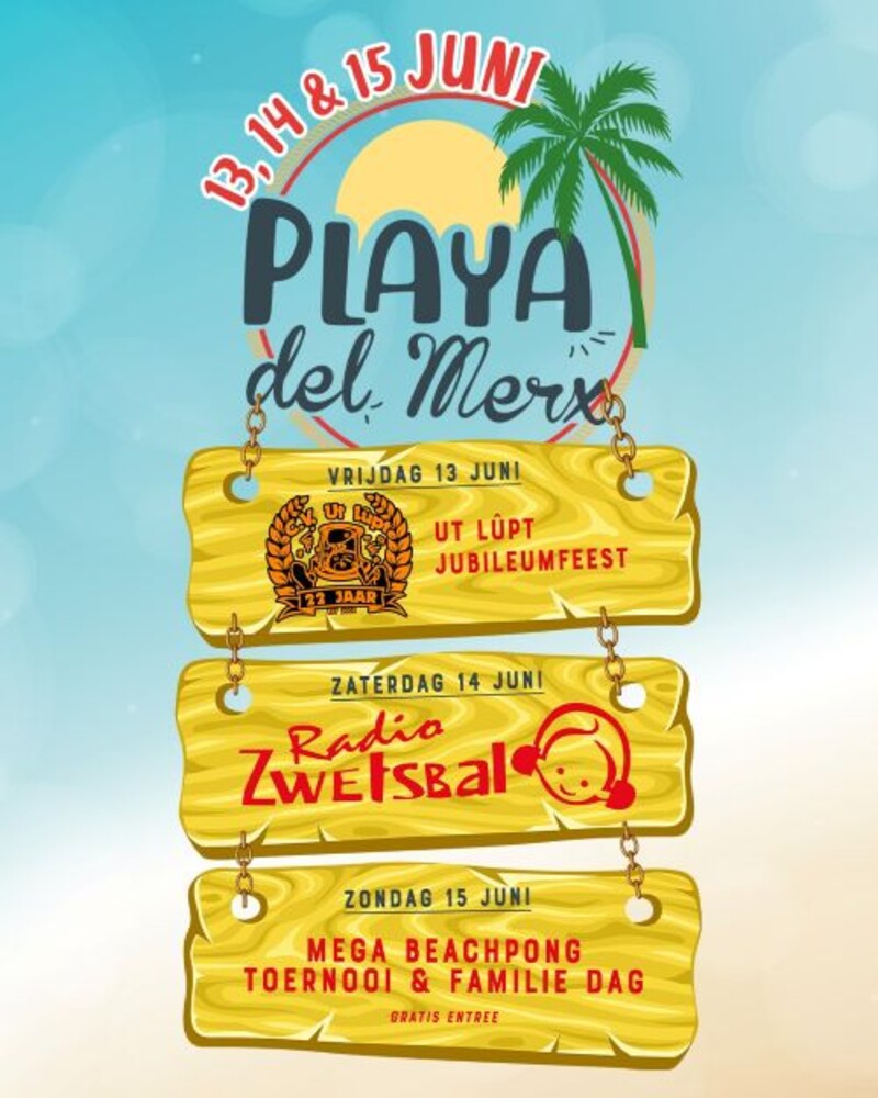 Het weekend van 13, 14 & 15 juni kun je weer lekker met je voetjes in het zand komen genieten van de leukste events. Vrijdag vieren we het jubileumfeest van C.V. Ut Lûpt groter dan groots met een avond zomercarnaval! Zaterdag kun je komen genieten van de zomereditie van Radio Zwetsbal, dat wordt één groot feest! En natuurlijk niet te missen op zondag het Mega-Beachpong toernooi.