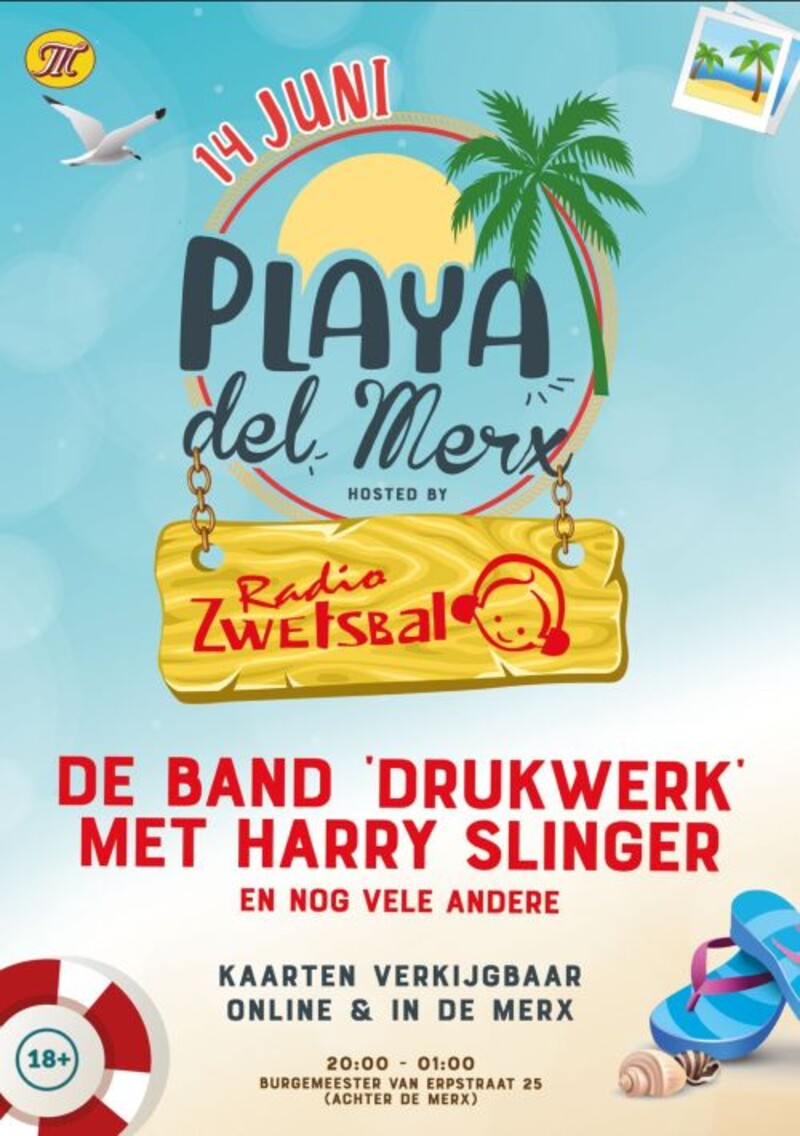 Zalencentrum De Merx organiseert samen met radio Zwetsbal de zomereditie van Playa del Merx op 14 juni 2025. Niemand minder dan de band Drukwerk treedt op bij Playa del Merx! De band komt anderhalf uur spelen met de 75-jarige Harry Slinger als frontman. Dat wordt een feestje! En nog